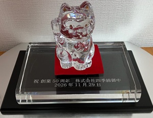 「バカラ 招き猫クリア ガラス台座小名入れ 1セット」 台座側面に「創業50周年 縁起株式会社様」 天面に「メール添付したロゴマーク希望」「書体5」 「側面は金色仕上げ」 11月29日着希望 など |