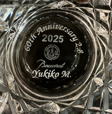 | ご希望バカラグラスでは名入れができないデザインや文字数などもあり、代替グラスや原稿などでご提案いたします。 原稿のご確認ご返事を頂きました後に製作いたしますので、修正変更は可能です。 底面への名入れは文字のみでご検討ください。  |